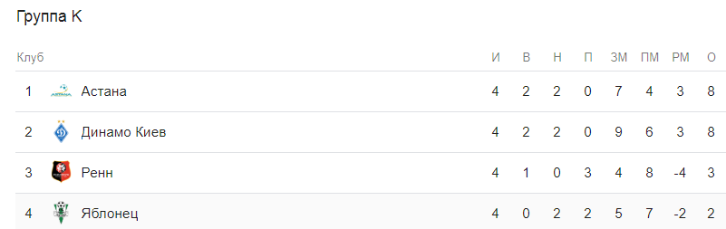 В копилке Динамо две победы (обе над Ренном 2:1 и 3:1) и две ничьих (с Астаной 2:2 и с Яблонцем 2:2).