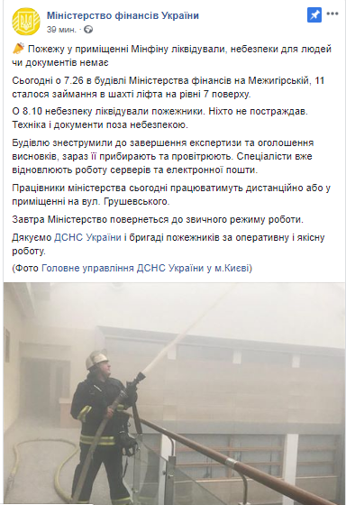 При пожаре в Минфине важные документы уцелели, сотрудники работают дистанционно