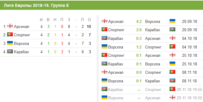 Турнирная таблица группы "Е" Лиги Европы перед пятым туром