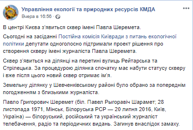 В Киеве появится сквер имени погибшего журналиста Павла Шеремета. Такое решение сегодня, 29 ноября, единогласно поддержала постоянная комиссия Киевсовета по вопросам экологической политики. Об этом сообщается в Facebook на странице ведомства.