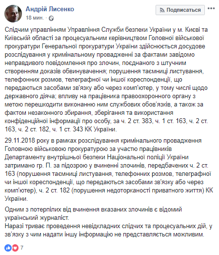 По словам Лысенко, одним из потерпевших от совершения указанных преступлений является известный украинский журналист. "Сейчас продолжается проведение неотложных следственных и процессуальных действий, в связи с чем предоставить другую информацию не представляется возможным", - написал Андрей Лысенко.