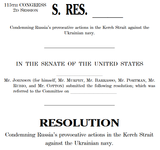 Вчера, 29 ноября, в сенате США единогласно приняли резолюцию под номером 709, в которой действия России в Керченском проливе названы провокацией и единогласно осуждаются.