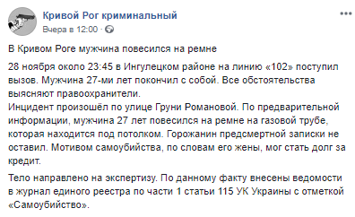 В Кривом Роге 27-летний мужчина покончил с собой, повесившись на ремне в собственной квартире. Инцидент произошел 28 ноября около 23:45 в Ингулецком районе города на улице Груни Романовой. Об этом сообщается на странице "Кривой Рог криминальный" в соцсети.