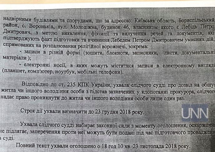 В рамках уголовного производства правоохранители проводят следственные действия, а именно обыски с целью выявить записи (тетради, блокноты, записные книжки, письма, документы) или электронные носители информации с целью выявления фактов, подтверждающих подготовку Митрополитом умышленных действий, направленных на разжигание религиозной вражды.