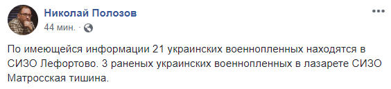 В Москве в СИЗО "Лефортово находятся 21 украинский военнопленный моряк, захваченный Россией в Керченском проливе, еще 3 раненых украинских военнопленных пребывают в лазарете СИЗО "Матросская тишина". Об этом сообщил адвокат Николай Полозов на своей странице в Facebook.