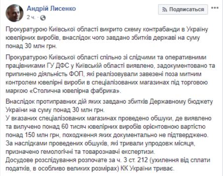 Прокуратура разоблачила схему контрабанды в Украину ювелирных изделий, что нанесло государству ущерб на более чем 30 миллионов гривен. Об этом сообщает в Facebook пресс-секретарь Генеральной прокуратуры Андрей Лысенко.