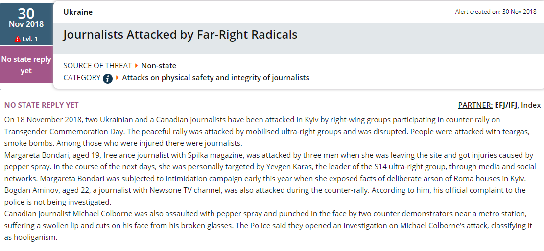 "18 ноября 2018 года два украинских и один канадский журналист подверглись нападению в Киеве правыми группами, участвовавшими протестах против проведения митинга в честь Дня памяти трансгендеров. Мирный митинг был атакован мобилизованными ультраправыми группами. Против людей применяли  слезоточивый газ, дымовые шашки. Среди пострадавших были журналисты",  - говорится в сообщении.
