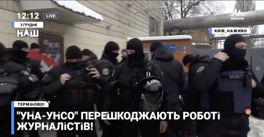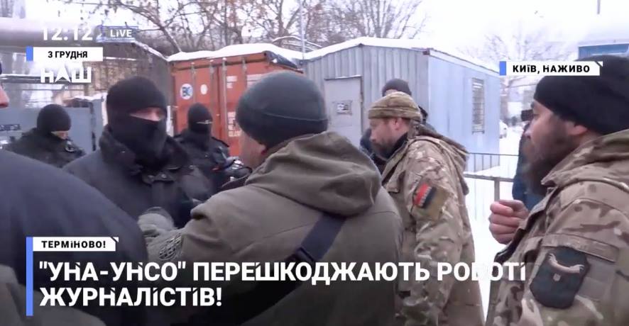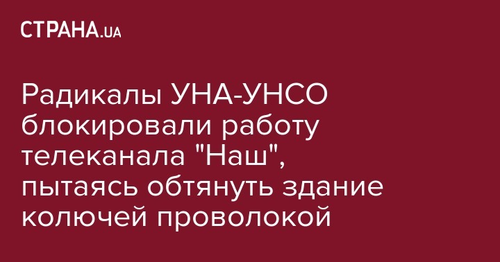 Сегодня, 3 декабря, несколько десятков радикалов из организации УНА-УНСО блокируют работу телеканала "НАШ". Люди пытаются обтянуть здание колючей проволокой, сотрудники телеканала вызвали полицию. На место прибыло около десятка представителей правоохранительных органов. Об этом сообщают "Вести"