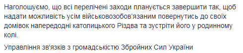В Генштабе заверили, что учения закончат до католического Рождества, чтобы военные успели вернуться домой на празднование.