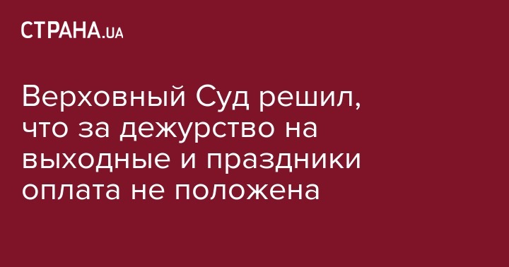 ВС оставил в силе решение апелляционного суда об отказе в удовлетворении иска к работодателю: "Апелляционный суд установил, что истец был привлечен в выходные и праздничные дни именно к дежурству, а не к работе в связи с производственной необходимостью для оперативного решения в эти дни неотложных производственных вопросов и для координации работы предприятия. Это подтверждается графиком дежурств ответственных работников, утвержденным приказами директора ІП "Южная Стівідоринг Компані Лімітед", а также копиями табелей учета использования рабочего времени ІП "Южная Стівідоринг Компані Лімітед", в которых праздничные и выходные дни дежурств истца не указаны, как рабочие дни".