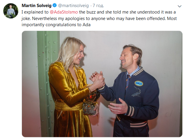 "Немного удивлен тому, что читаю в сети, ведь я не хотел никого обидеть. Это была шутка, возможно, плохая, и я хочу извиниться за это. Не знал, что это могут посчитать преступлением. Люди, которые следили за мной в течение 20 лет знаю, как я уважительно отношусь к женщинам", - заявил Сольвейг в cвоем видеообращении в Twitter.