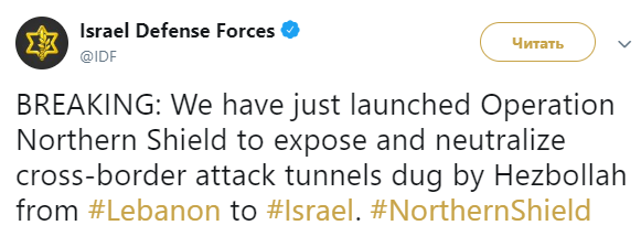 На фоне крупных столкновений между израильтянами и палестинцами на границе с Ливаном Тель-Авив начал военную операцию "Северный щит". Об этом сообщает Twitter армии Израиля.