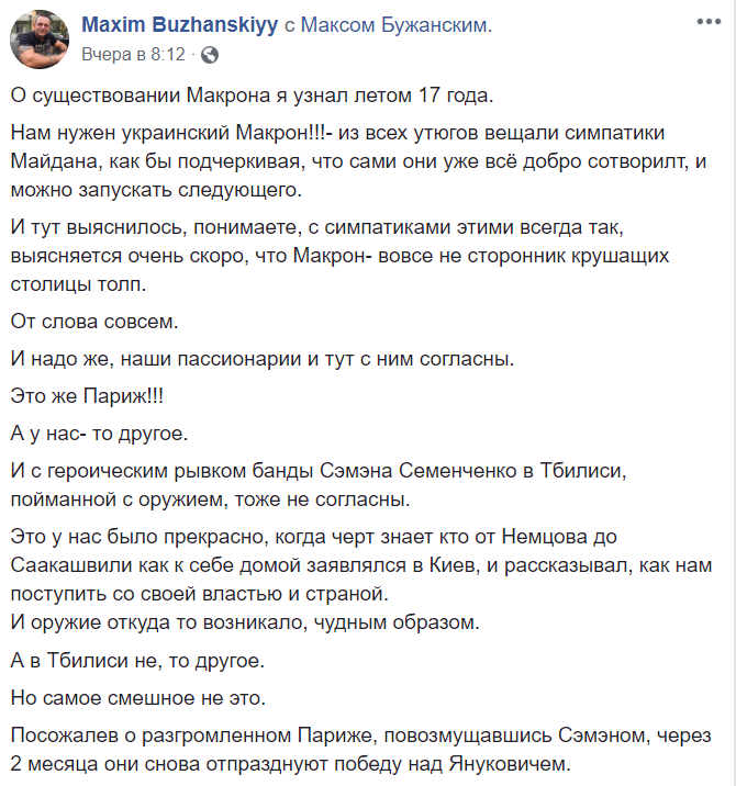 Это у нас было прекрасно, когда черт знает кто от Немцова до Саакашвили как к себе домой заявлялся в Киев, и рассказывал, как нам поступить со своей властью и страной. И оружие откуда то возникало, чудным образом. А в Тбилиси не, то другое.