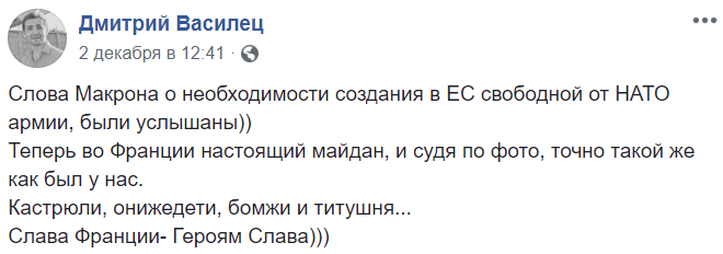 "Слова Макрона о необходимости создания в ЕС свободной от НАТО армии, были услышаны. Теперь во Франции настоящий майдан, и судя по фото, точно такой же как был у нас.