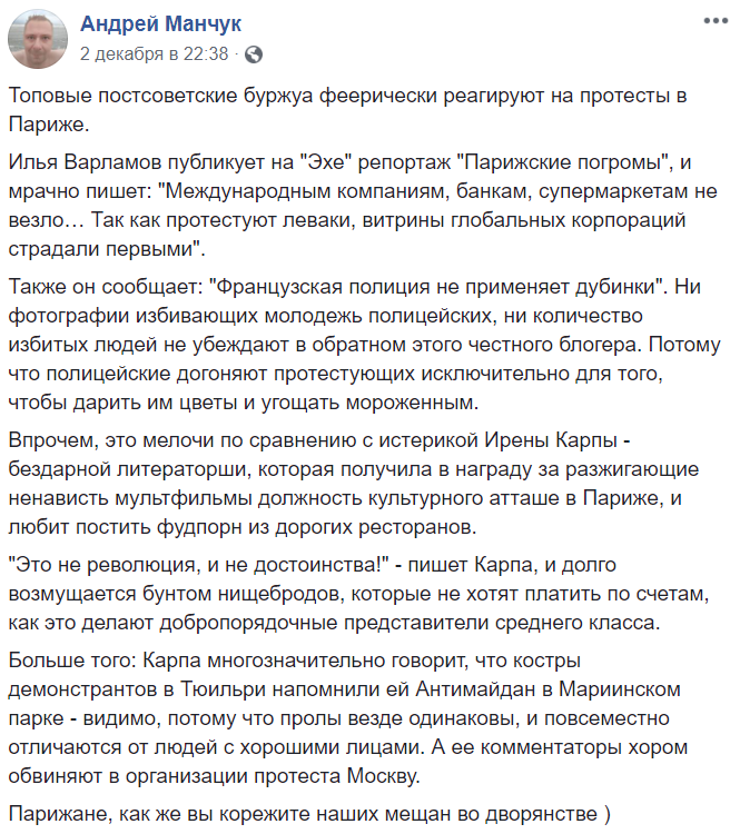 "Топовые постсоветские буржуа феерически реагируют на протесты в Париже.