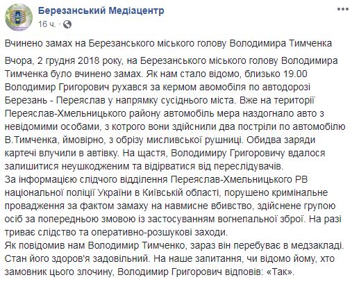 "2 декабря 2018 года, на Березанского городского голову Владимира Тимченко было совершено покушение. Как нам стало известно, около 19:00 Владимир Григорьевич двигался за рулем автомобиля по автодороге Березань-Переяслав в направлении соседнего города. Уже на территории Переяслав-Хмельницкого района автомобиль мэра настигло авто с неизвестными лицами, из которого они произвели два выстрела по автомобилю В. Тимченко, вероятно, из обреза охотничьего ружья. Оба заряда картечи попали в машину. К счастью, Владимиру Григорьевичу удалось остаться невредимым и оторваться от преследователей", - говорится в сообщении.