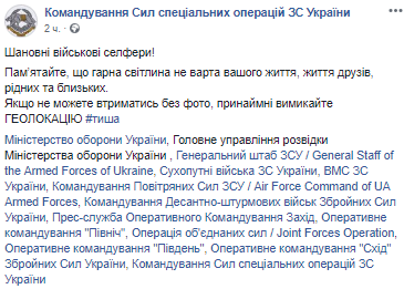 Украинским военным, которые любят делать селфи, порекомендовали отключать при этом геолокацию. Такой совет содержится в сообщении на странице Командования Сил специальных операций в Facebook.