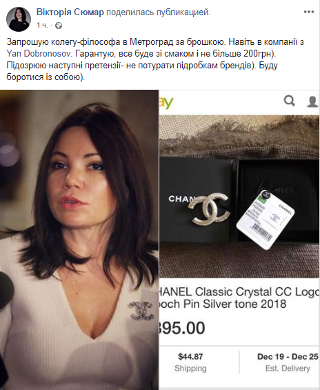 Также позже Сюмар опубликовала на своей странице в Facebook пост с приглашением журналистов в ТЦ за брошью, которая стоит "не больше 200 гривен" и обещанием "бороться с собой" и не потакать подделкам брендов.