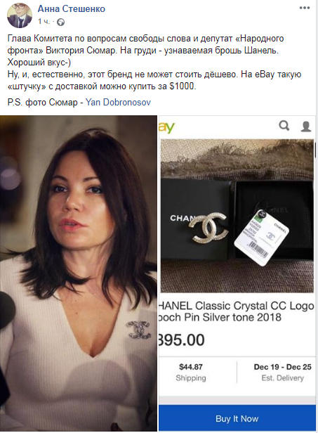 Глава Комитета по вопросам свободы слова, надреп от "Народного фронта" Виктория Сюмар появилась в Верховной Раде с брендовой брошью от Chanel. Об этом на своей странице в Facebook написала журналистка Анна Стешенко.