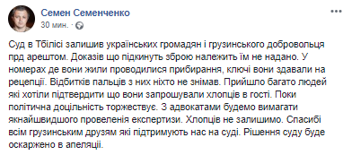 "Суд в Тбилиси оставил украинских граждан и грузинского добровольца под арестом", - написал Семенченко и добавил, что намерен совместно с адвокатам требовать проведения экспертизы, кроме того, будет подана апелляция.