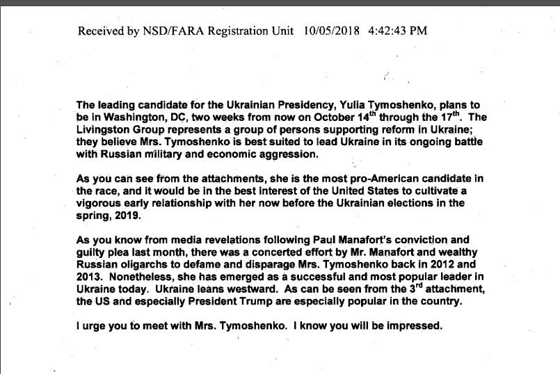 Она опубликовала документы компании The Livingston Group LLC, в которых говорится об организации встреч для лидера "Батькивщины" в октябре - однако тогда Тимошенко так и не полетела в США.