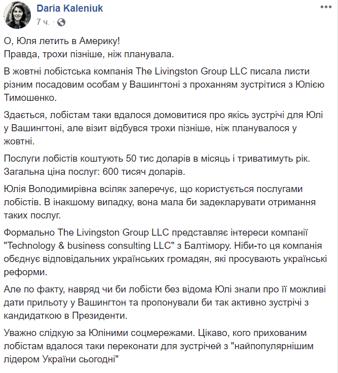 А журналистка Дарья Каленюк утверждает, что встречи в США ей организовали лоббистские компании, которым платят по 50 тысяч долларов в месяц.