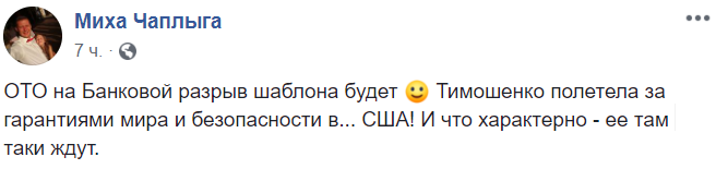 "На Банковой разрыв шаблона будет. Тимошенко полетела за гарантиями мира и безопасности в... США! И что характерно - ее там таки ждут", - считает политолог Михаил Чаплыга.