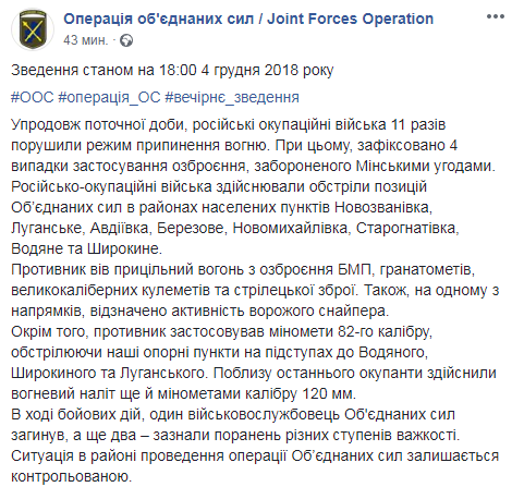 "В ходе боевых действий, один военнослужащий объединенных сил погиб, а еще два получили ранения различной степени тяжести. Ситуация в районе проведения операции объединенных сил остается контролируемой", - сказано в сводке.