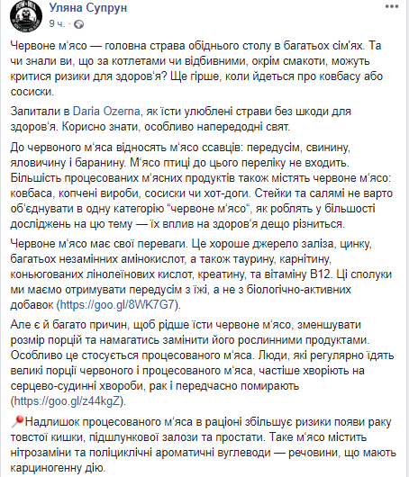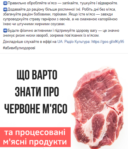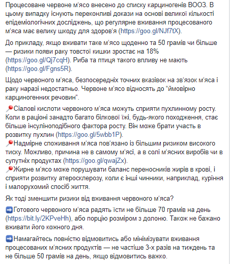 Также и.о. главы Минздрава дала несколько советов украинцев о том, как уменьшить риски при потреблении мяса. По ее словам, готового красного мяса советуют есть не более 70 граммов в день, нежелательно употреблять его каждый день. Колбасы и сосиски рекомендуется есть не чаще 3-х раз в неделю и не более 50 граммов в день, если отказаться трудно.