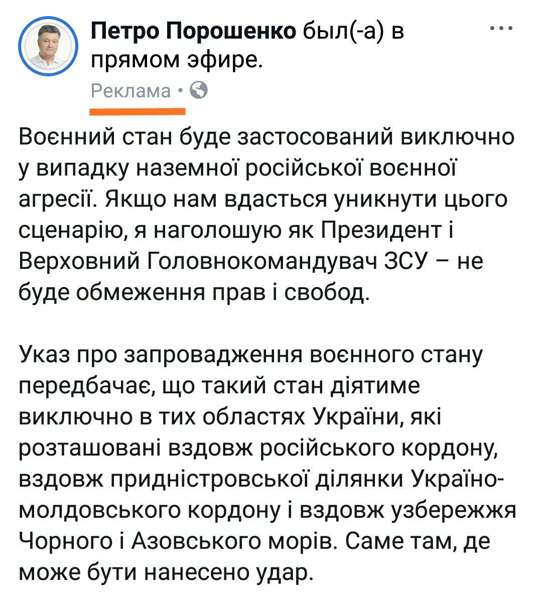После введения в Украине военного положения в Facebook появилась реклама поста со страницы президента Украины Петра Порошенко от 26 ноября, опубликованного в 21:20.