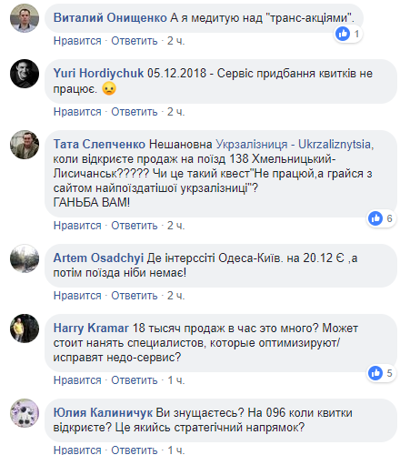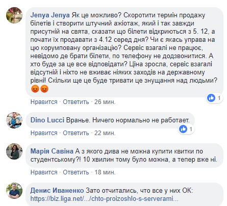 Покупатели возмущены сложившейся ситуацией и считают, что это искусственная попытка создать ажиотаж, который и так возникает перед зимними праздниками. Также украинцы пишут о проблемах при покупке билетов по студенческому и о том, что невозможно связаться с техподдержкой.
