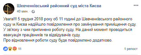 5 декабря около 11:00 поступило сообщение о минировании здания Шевченковского районного суда в Киеве, расположенного по улице Дегтяревской, 31а. Об этом сообщает пресс-служба суда на своей странице в Facebook.