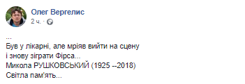"[Рушковский] был в больнице, но мечтал выйти на сцену", - написал журналист. О причинах смерти актера пока не сообщается.
