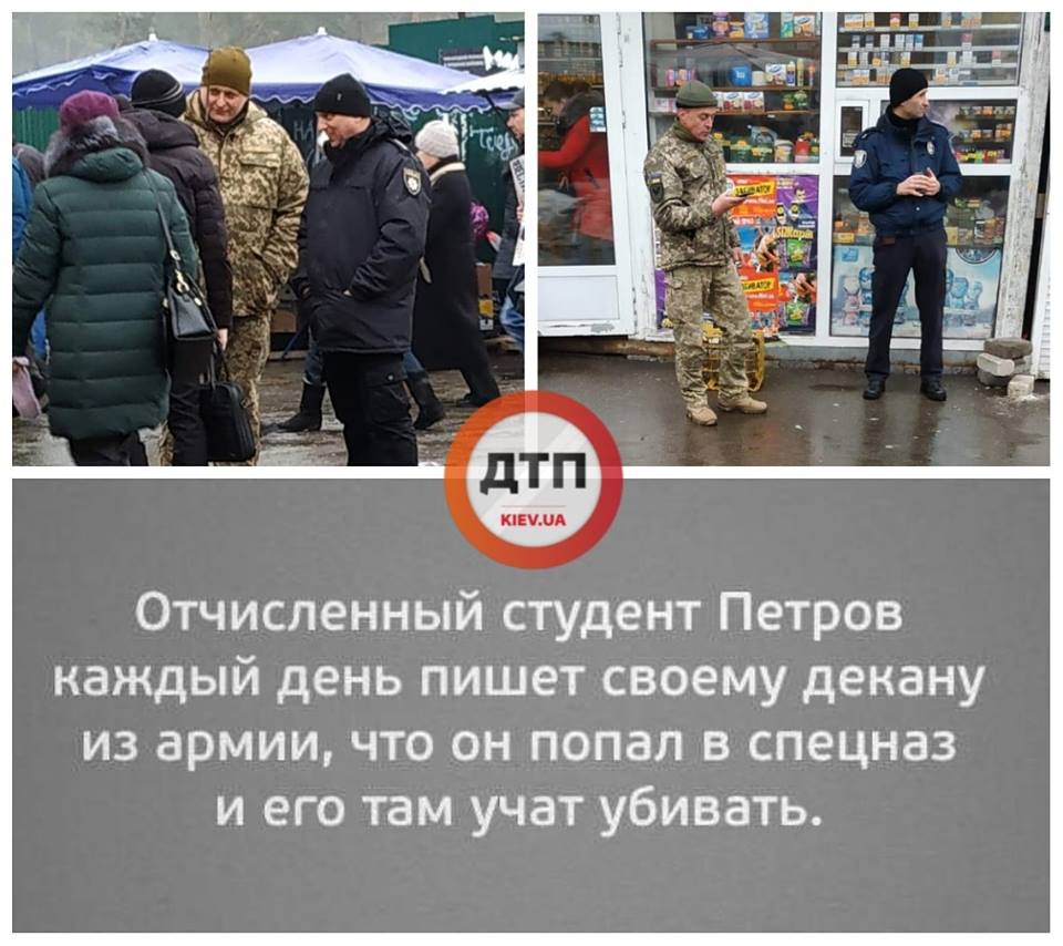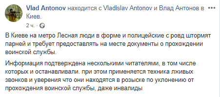 В Киеве 5 декабря люди в форме проводят рейды по вылавливанию молодых людей, которые уклоняются от воинской службы. Об этом на своей странице в Facebook сообщает руководитель проекта dtp.kiev.ua Владислав Антонов.