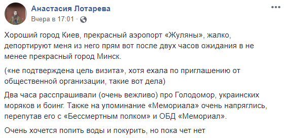 Журналистка рассказала, что пограничники задавали ей вопросы про Боинг, украинских моряков и голодомор Фото: facebook.com/nastya.lotareva
