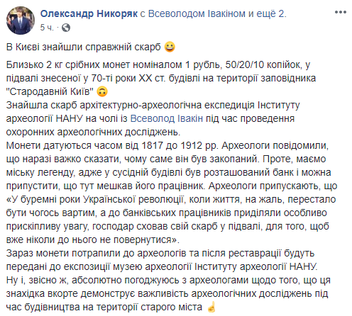 "Около 2 кг серебряных монет номиналом 1 рубль, 50/20/10 копеек, в подвале снесенного в 70-ые годы ХХ ст. здания на территории заповедника "Древний Киев". Нашла сокровища архитектурно-археологическая экспедиция Института археологии НАНУ во главе со Всеволодом Ивакиным во время проведения охранных археологических исследований", - написал он.
