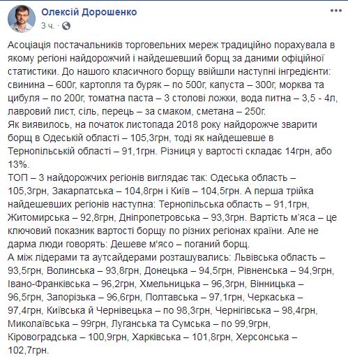 По состоянию на начало ноября дороже всего сварить борщ в Одесской области - 105,3 грн, дешевле - в Тернопольской области - 91,1 грн. Разница в стоимости составляет 14 грн, или 13%. Об этом написал глава Ассоциации поставщиков торговых сетей Алексей Дорошенко, ссылаясь на данные официальной статистики, на своей странице в социальной сети Facebook.