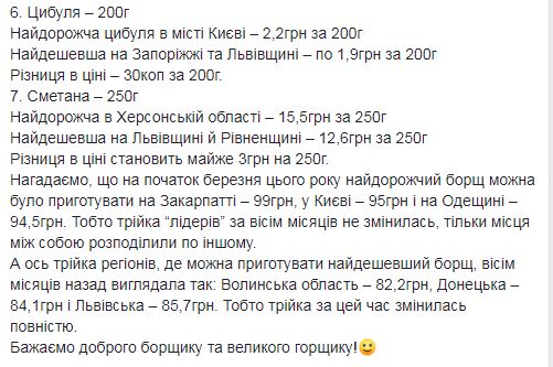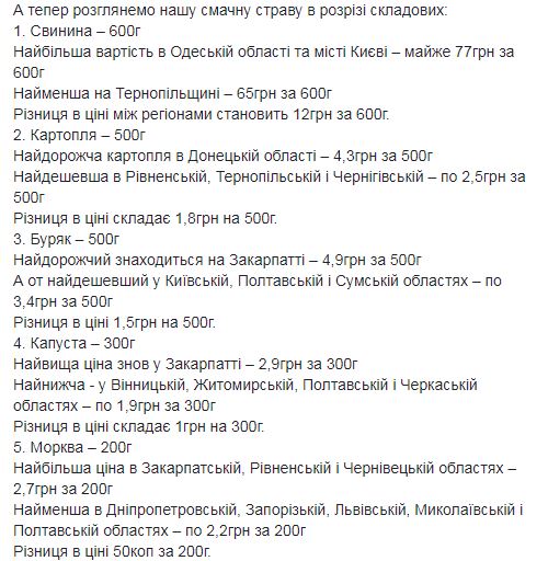 Кроме Одесской в тройку лидеров по стоимости борща также вошли Закарпатская область - 104,8 грн и Киев - 104,5 грн. Первая тройка самых дешевых регионов такая: Тернопольская область - 91,1 грн, Житомирская - 92,8 грн, Днепропетровская - 93,3 грн.