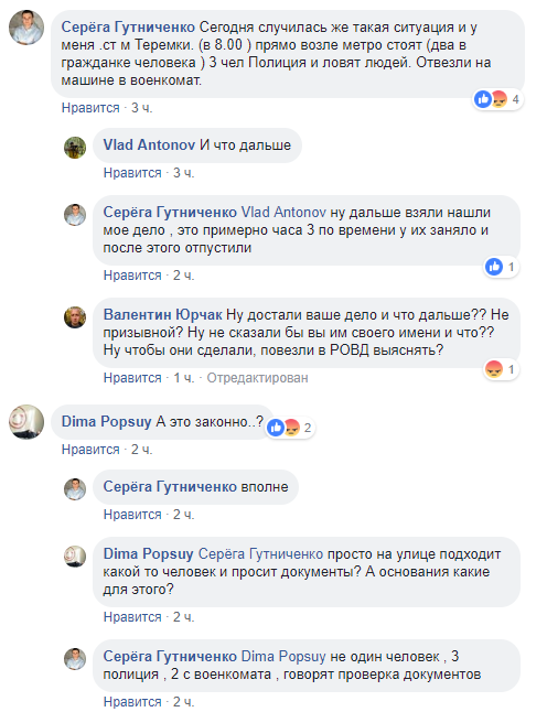 "Сегодня случилась же такая ситуация и у меня .ст м Теремки. (в 8.00 ) прямо возле метро стоят (два в гражданке человека ) 3 чел Полиция и ловят людей. Отвезли на машине в военкомат", - пишет пользователь Сергей Гутниченко, которого отвезли в военный комиссариат.