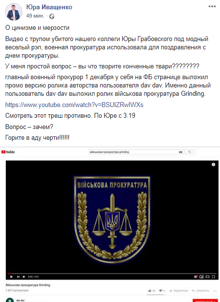 "Видео с трупом убитого нашего коллеги Юры Грабовского под модный веселый рэп, военная прокуратура использовала для поздравления с днем прокуратуры... Главный военный прокурор 1 декабря у себя на ФБ странице выложил промо версию ролика авторства пользователя dav dav. Именно данный пользователь dav dav выложил ролик "військова прокуратура Grinding", - написал он.