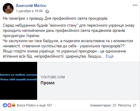 Главный военный прокурор Украины Анатолий Матиос накануне дня прокуратуры выложил на своей странице в Facebook промо-версию ролика, в полной версии которого демонстрируются кадры с трупом убитого адвоката Юрия Грабовского под американский рэп. Об этом на своей странице в соцсети написал адвока Юрий Иващенко.