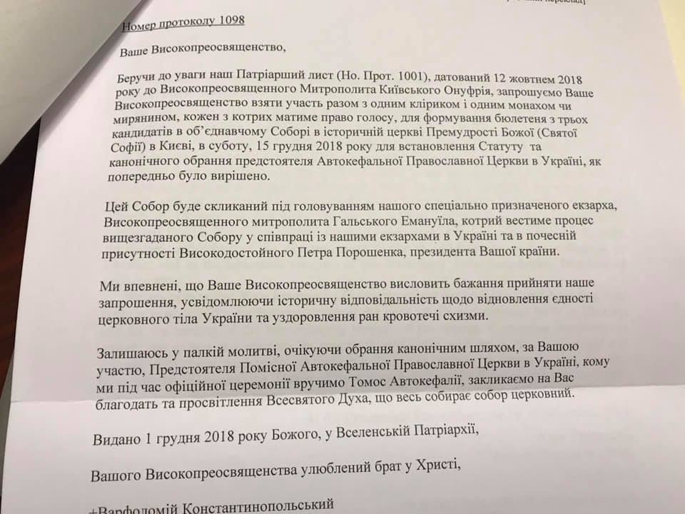 "Приглашаем Ваше Высокопреосвященство принять участие вместе с одним клириком и одним монахом или мирянином, каждый из которых будет иметь право голоса, для формирования бюллетеня из трех кандидатов в объединительном Соборе в исторической церкви Премудрости Божией (Святой Софии) в Киеве, в субботу, 15 Декабря 2018 года для принятия Устава и канонического избрания предстоятеля Автокефальной Православной Церкви в Украине, как предварительно было решено", - говорится в письме Вселенской Патриархии.