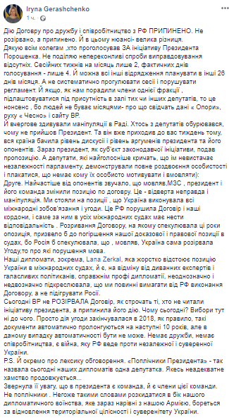 "Сегодня ВР не расторгла договор, как строчат те, кто не читали инициативу президента, а прекратила его действие. Почему сегодня? Выборы здесь ни при чем. Просто действие соглашения заканчивалось в 2018, как правило, такие документы автоматически продлеваются на следующие 10 лет, но в данном случае автоматизма быть не может. Нет дружбы, нет сотрудничества, есть война, которую РФ ведет против независимой и суверенной Украины", - написала Геращенко.
