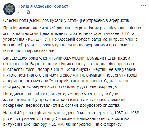 Силовики разыскали в столице группу экстрасенсов-аферистов. Об этом сообщает пресс-служба областной полиции на своей странице в Facebook в четверг, 6 декабря.