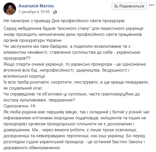 Вот опубликованный Матиосом пост от 1 декабря Фото: facebook.com/MatiosAnatolii