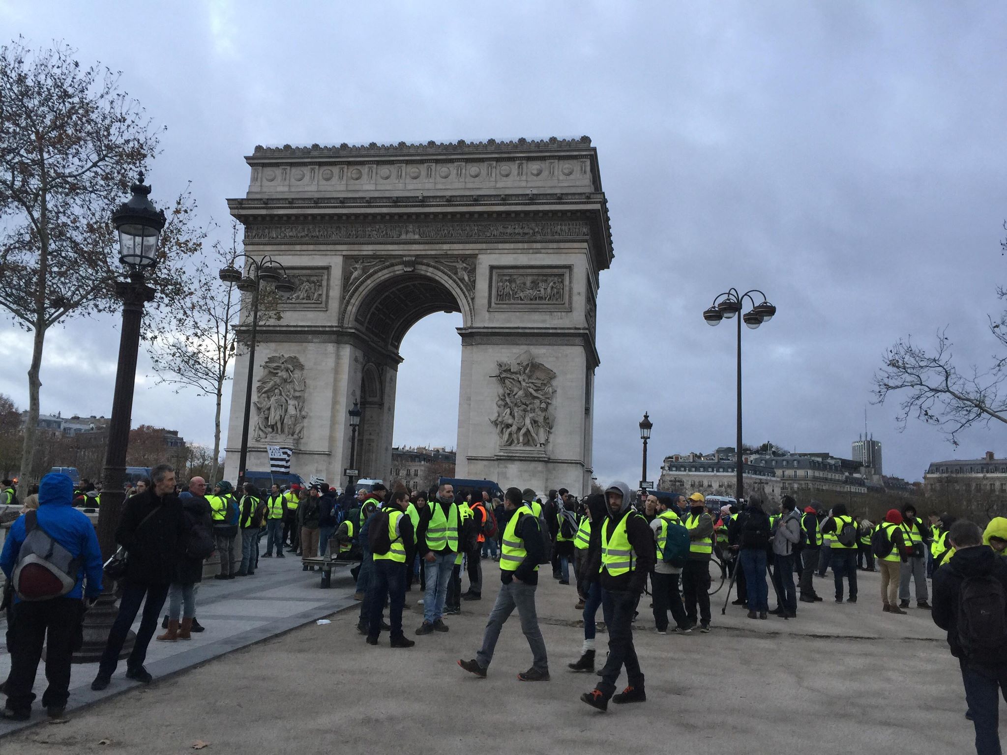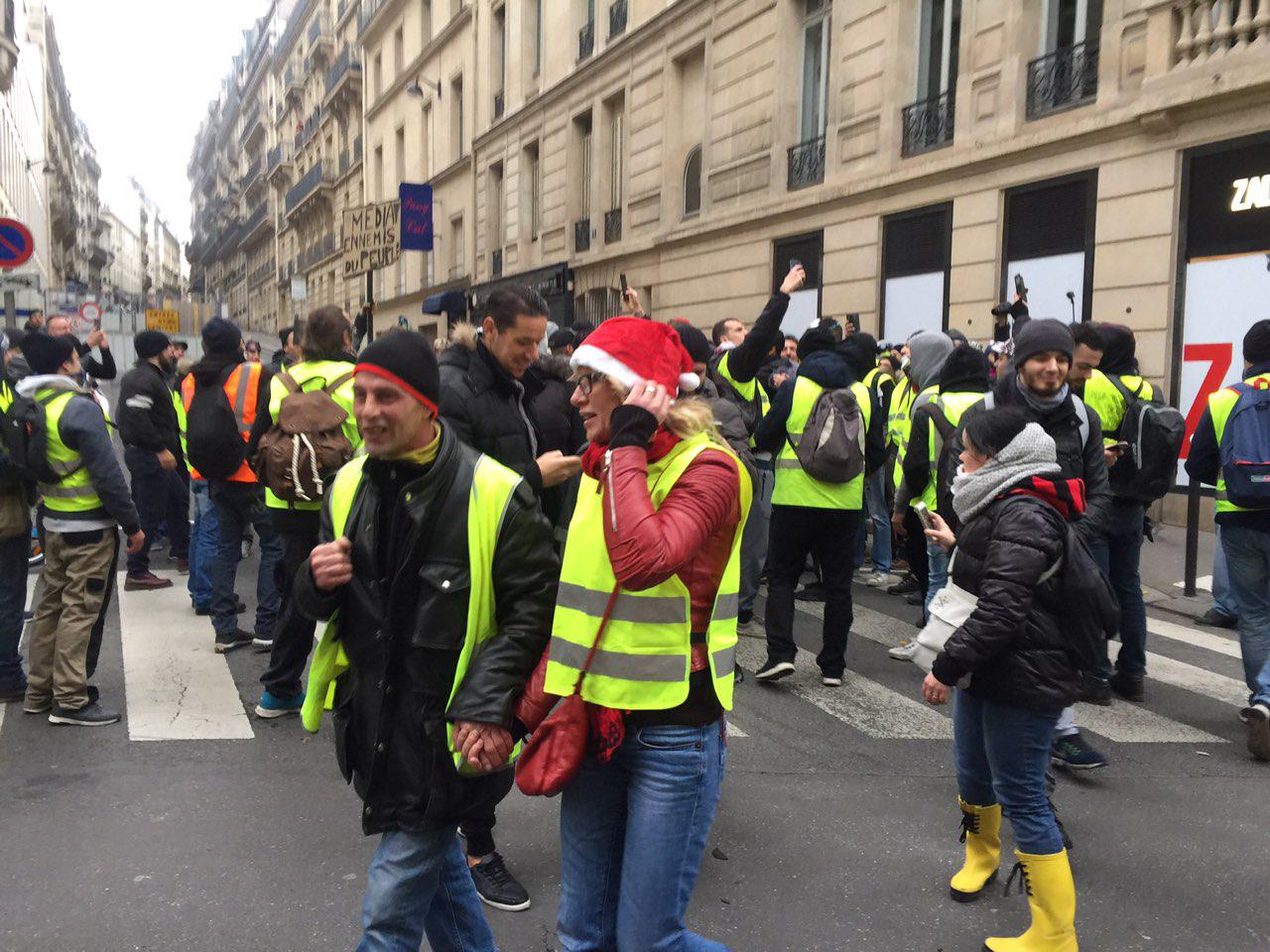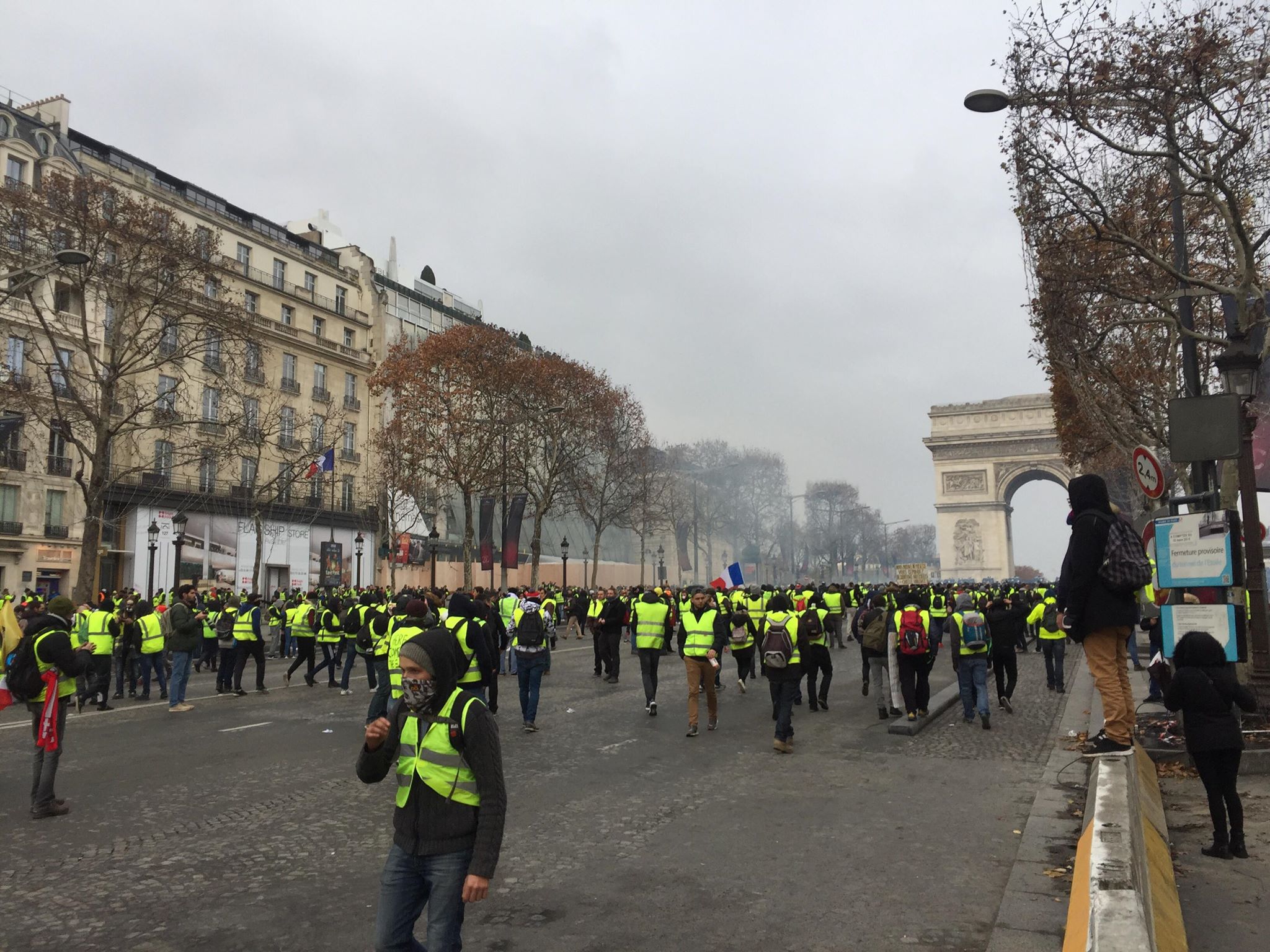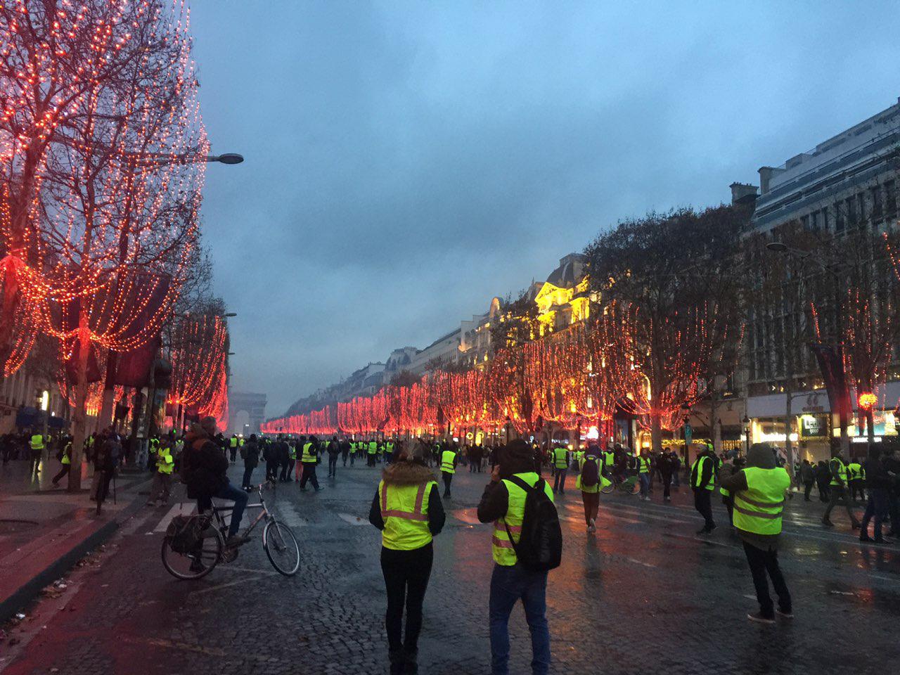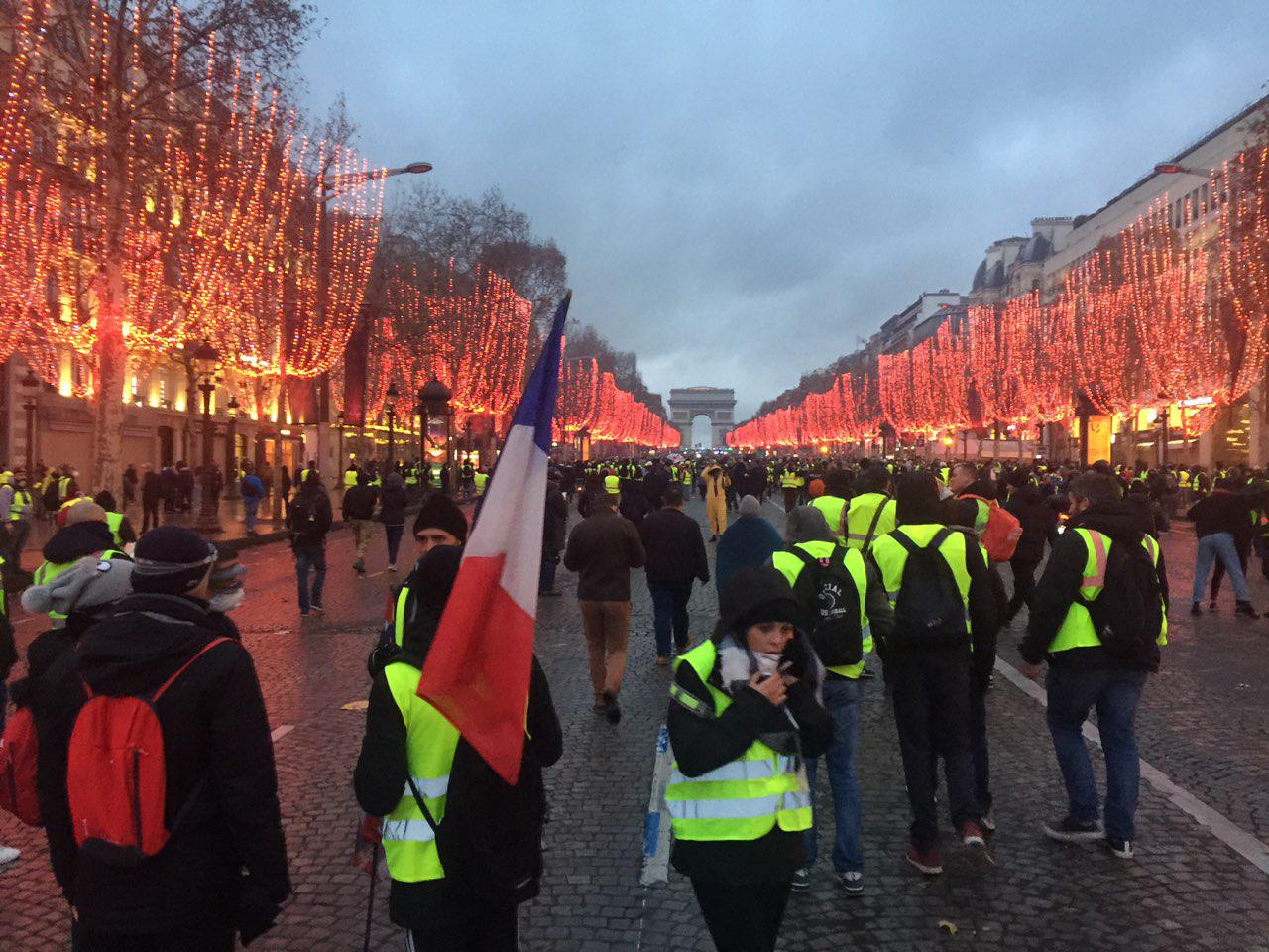 Пик протестов пришелся на 1 декабря. Общее число протестующих по всей стране оценивалось полицией в 136 тысяч человек. Также не обошлось без погромов, поджогов машин, разрушений магазинов и банков. Была повалена ограда сада Тюильри, разграблены магазины в центре города, а символ Парижа Триумфальная арка разрисована граффити.