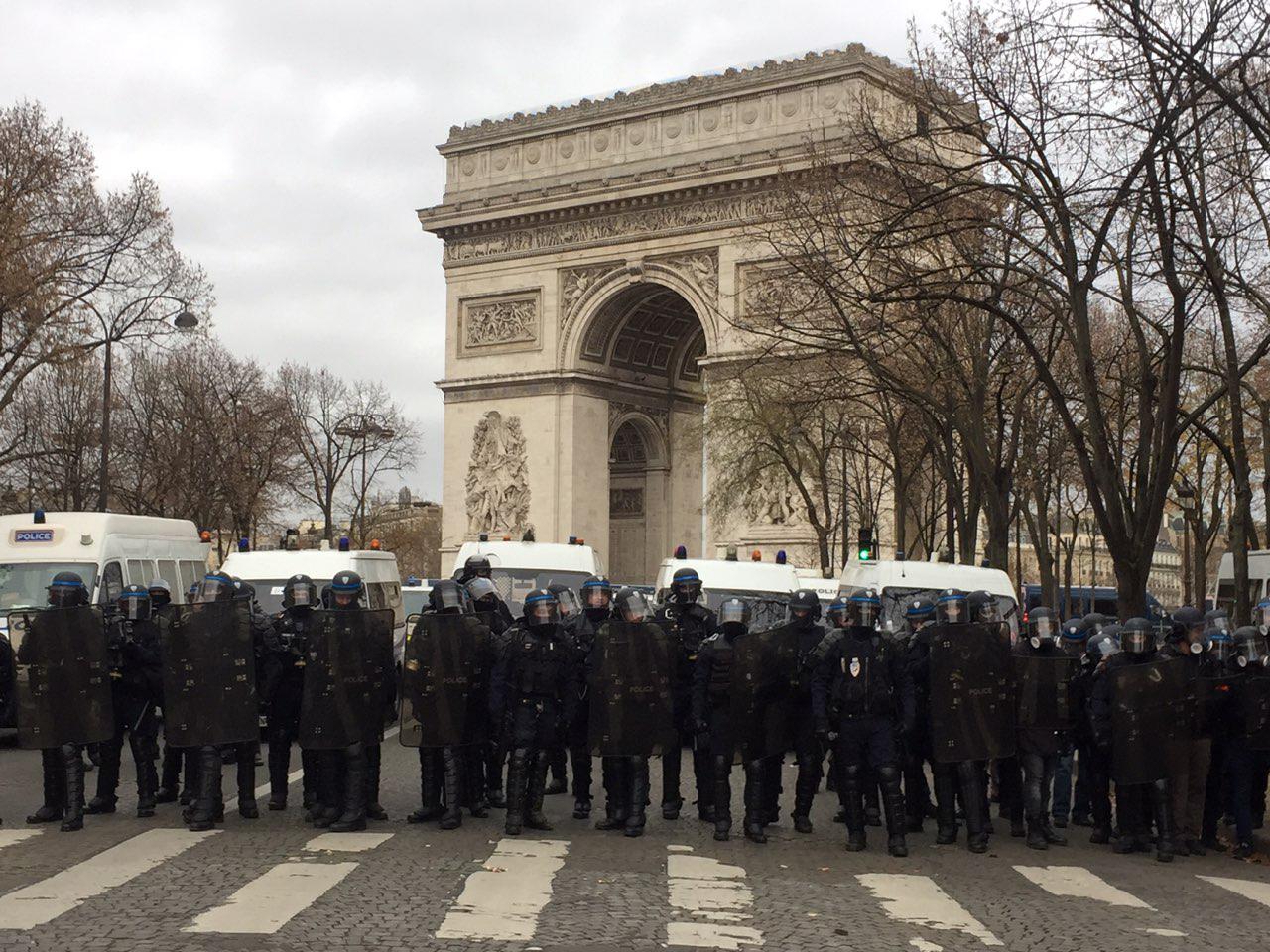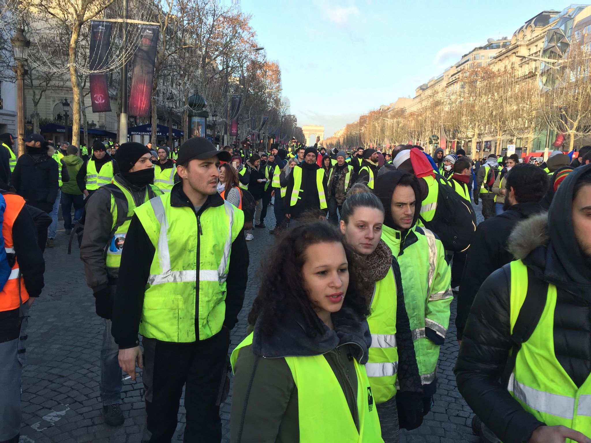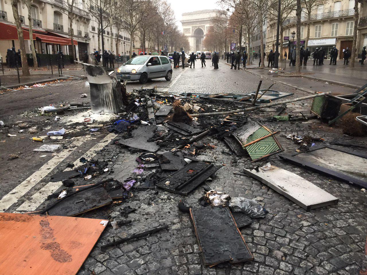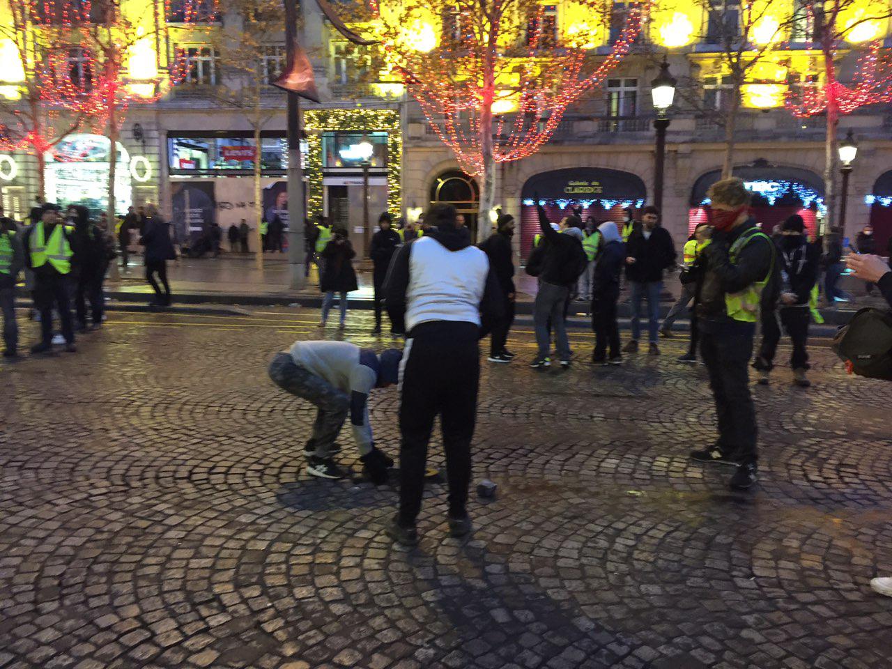 Пик протестов пришелся на 1 декабря. Общее число протестующих по всей стране оценивалось полицией в 136 тысяч человек. Также не обошлось без погромов, поджогов машин, разрушений магазинов и банков. Была повалена ограда сада Тюильри, разграблены магазины в центре города, а символ Парижа Триумфальная арка разрисована граффити.