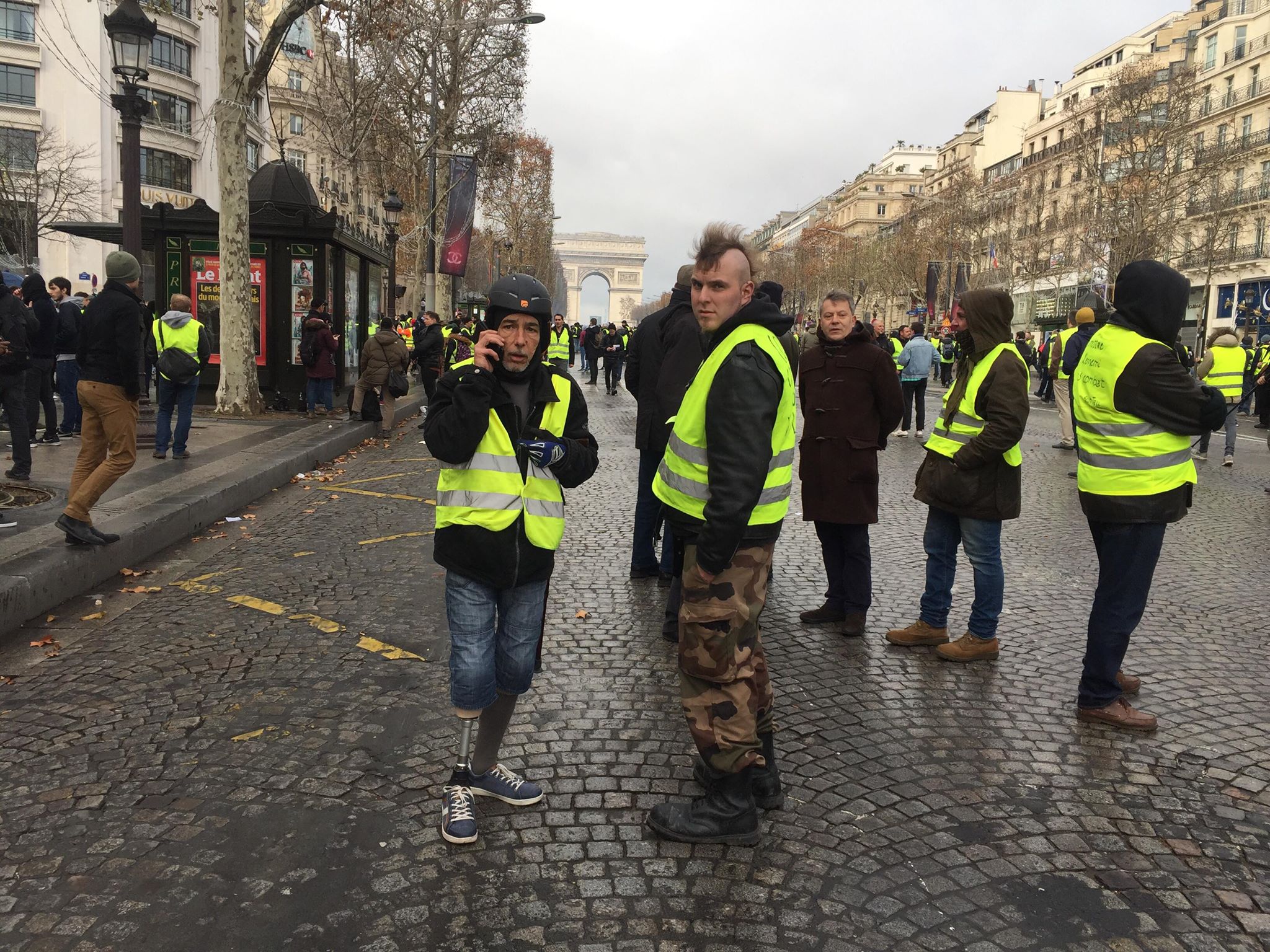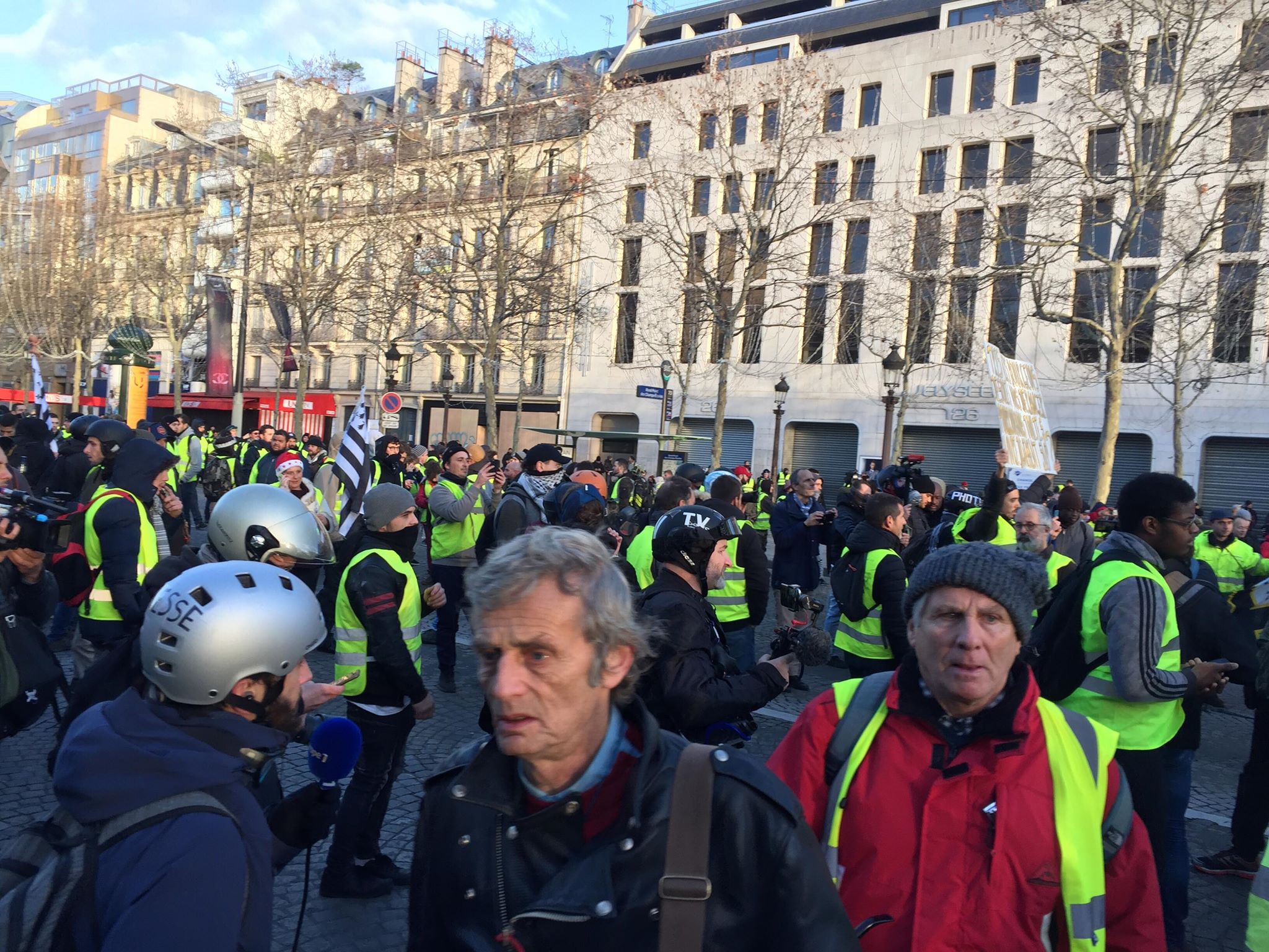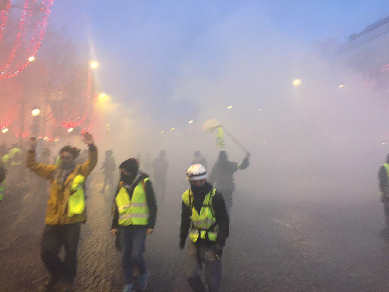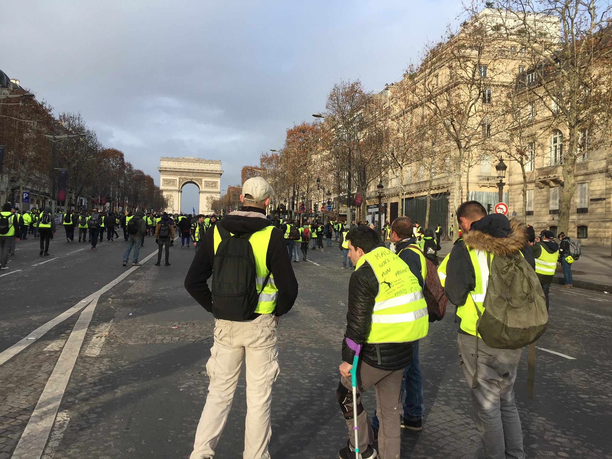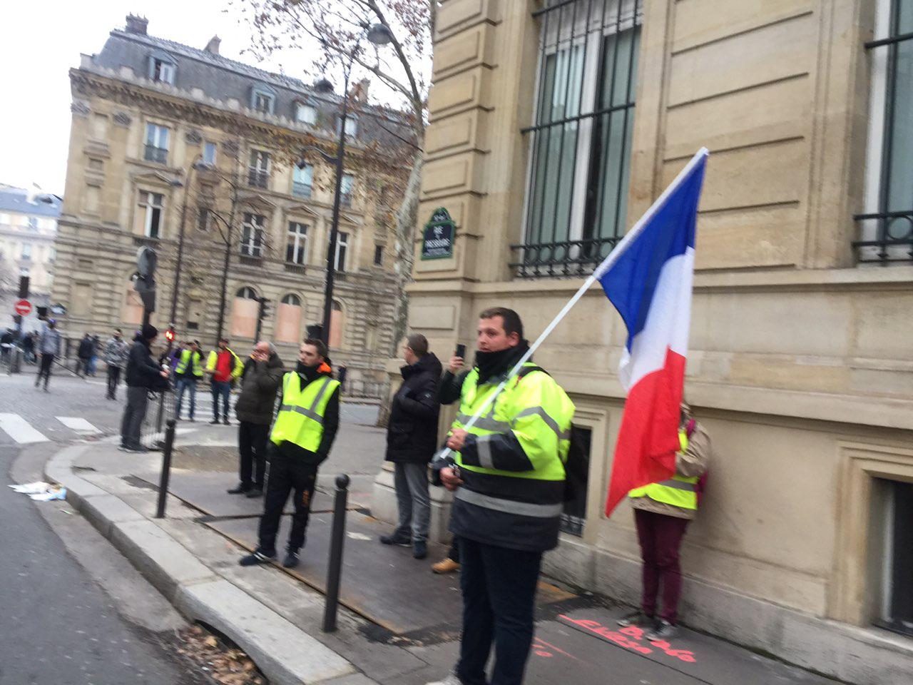 Пик протестов пришелся на 1 декабря. Общее число протестующих по всей стране оценивалось полицией в 136 тысяч человек. Также не обошлось без погромов, поджогов машин, разрушений магазинов и банков. Была повалена ограда сада Тюильри, разграблены магазины в центре города, а символ Парижа Триумфальная арка разрисована граффити.