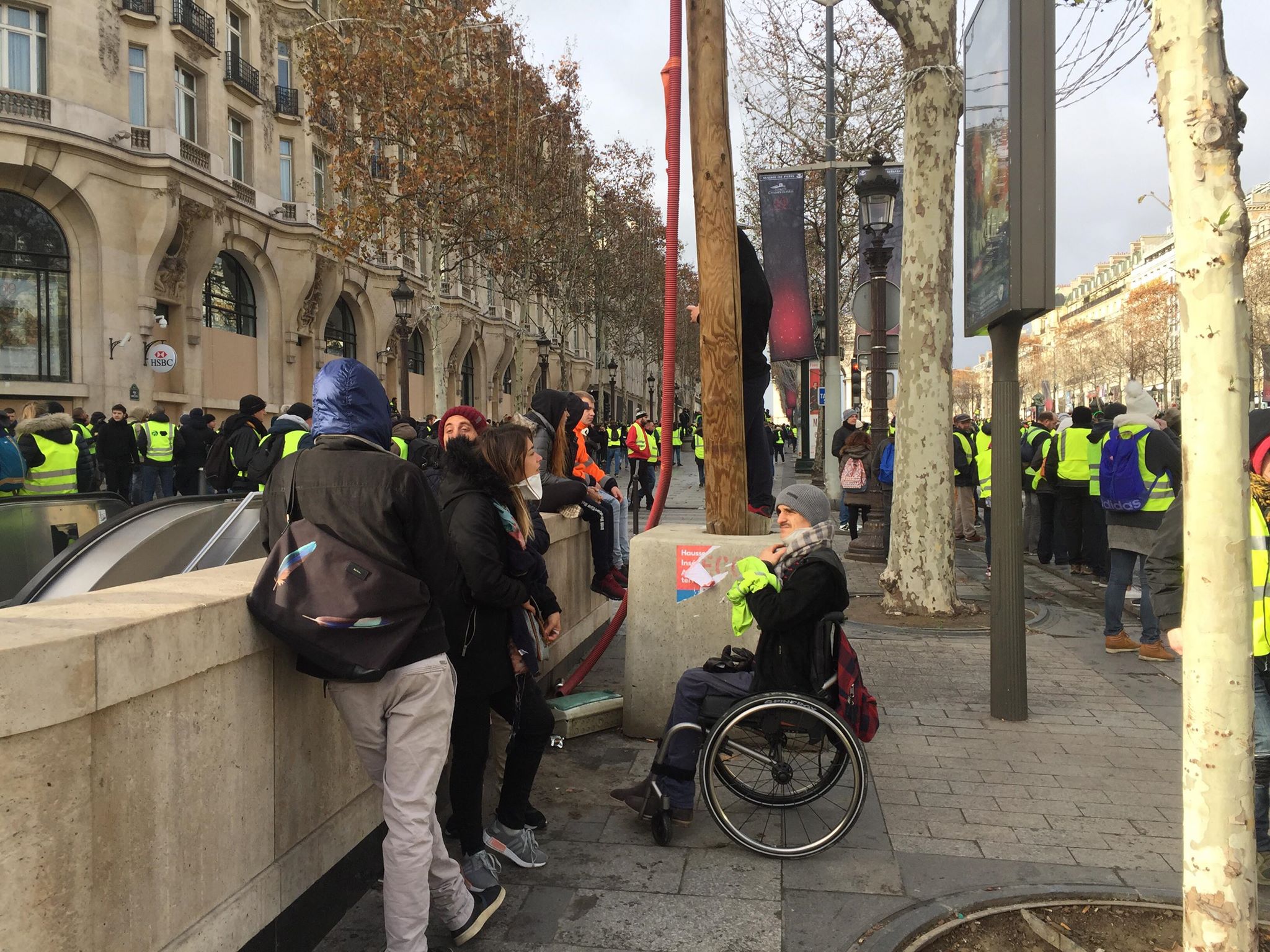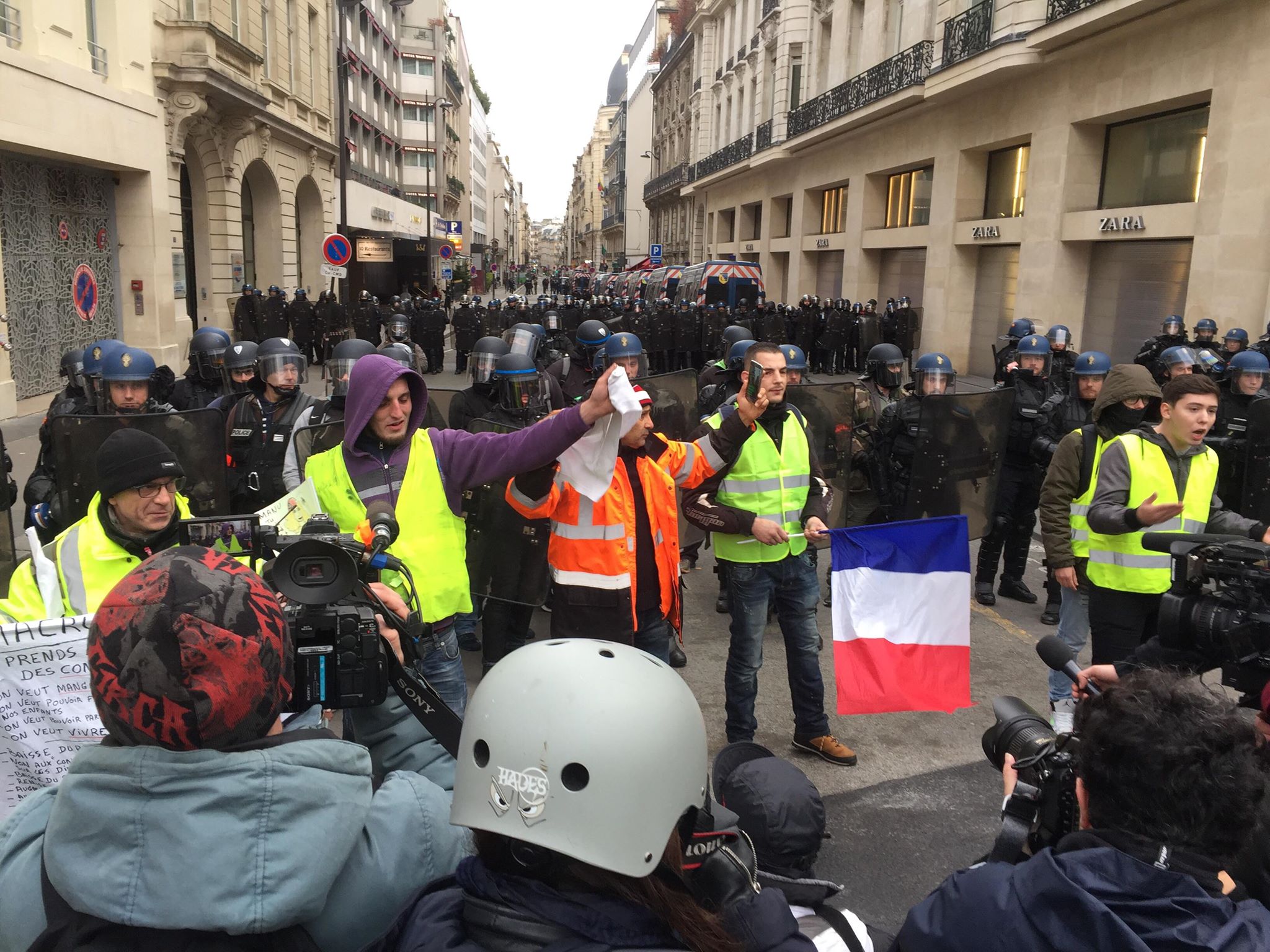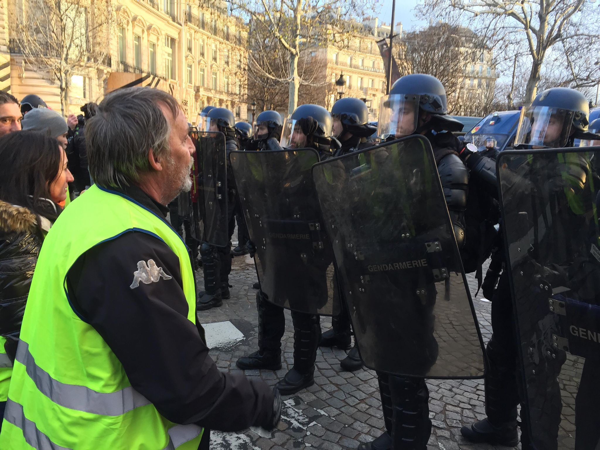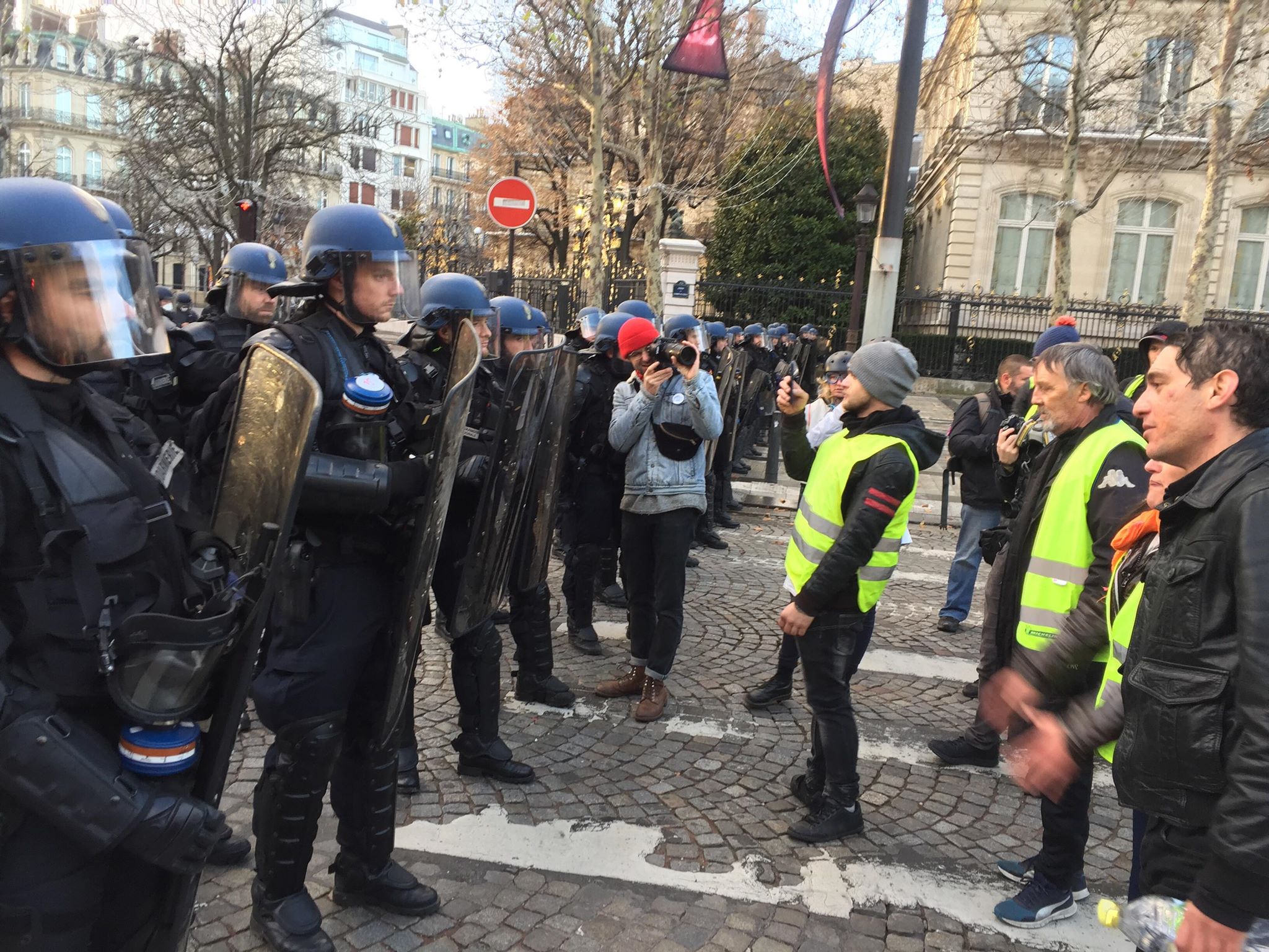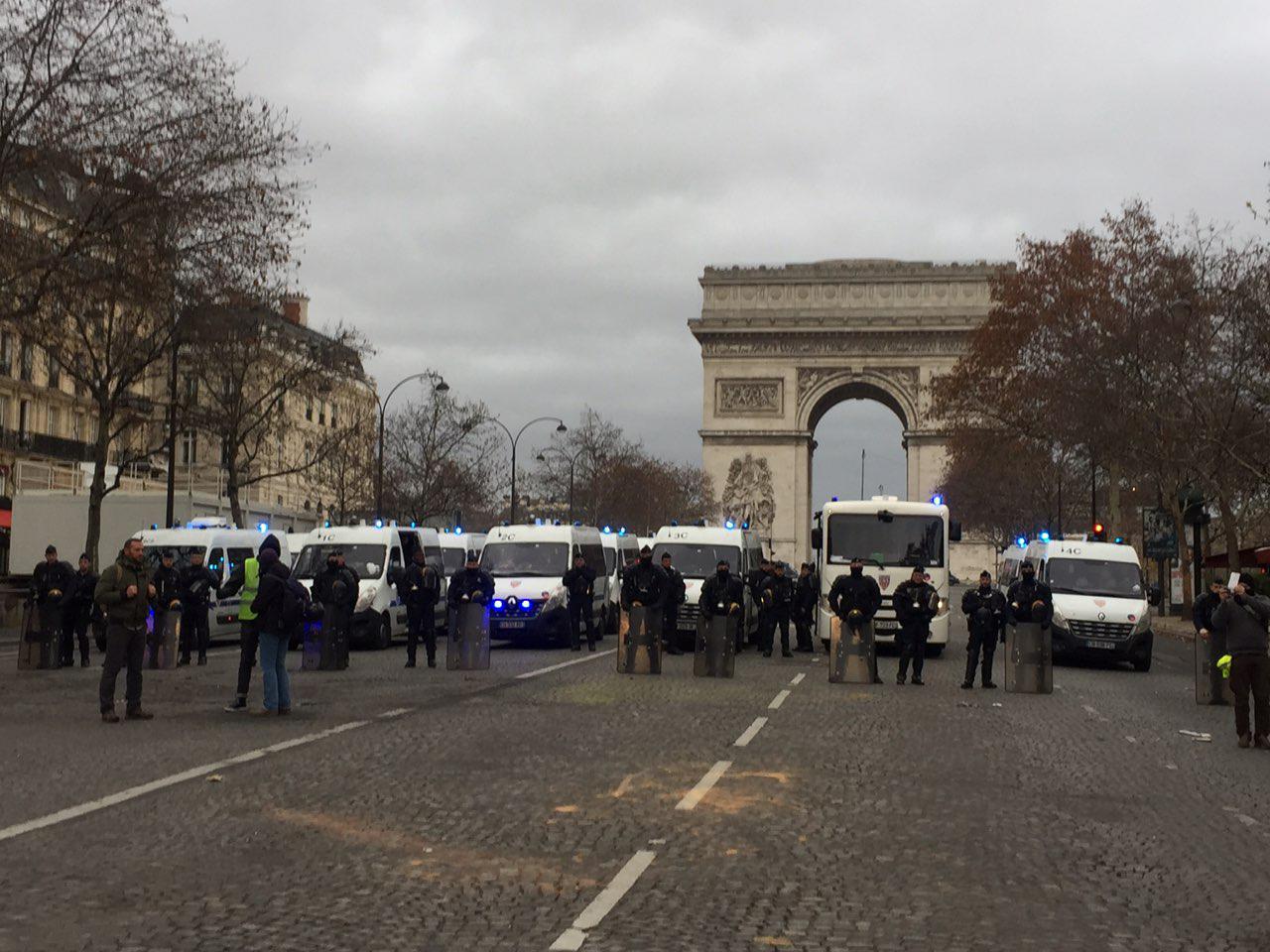 Пик протестов пришелся на 1 декабря. Общее число протестующих по всей стране оценивалось полицией в 136 тысяч человек. Также не обошлось без погромов, поджогов машин, разрушений магазинов и банков. Была повалена ограда сада Тюильри, разграблены магазины в центре города, а символ Парижа Триумфальная арка разрисована граффити.