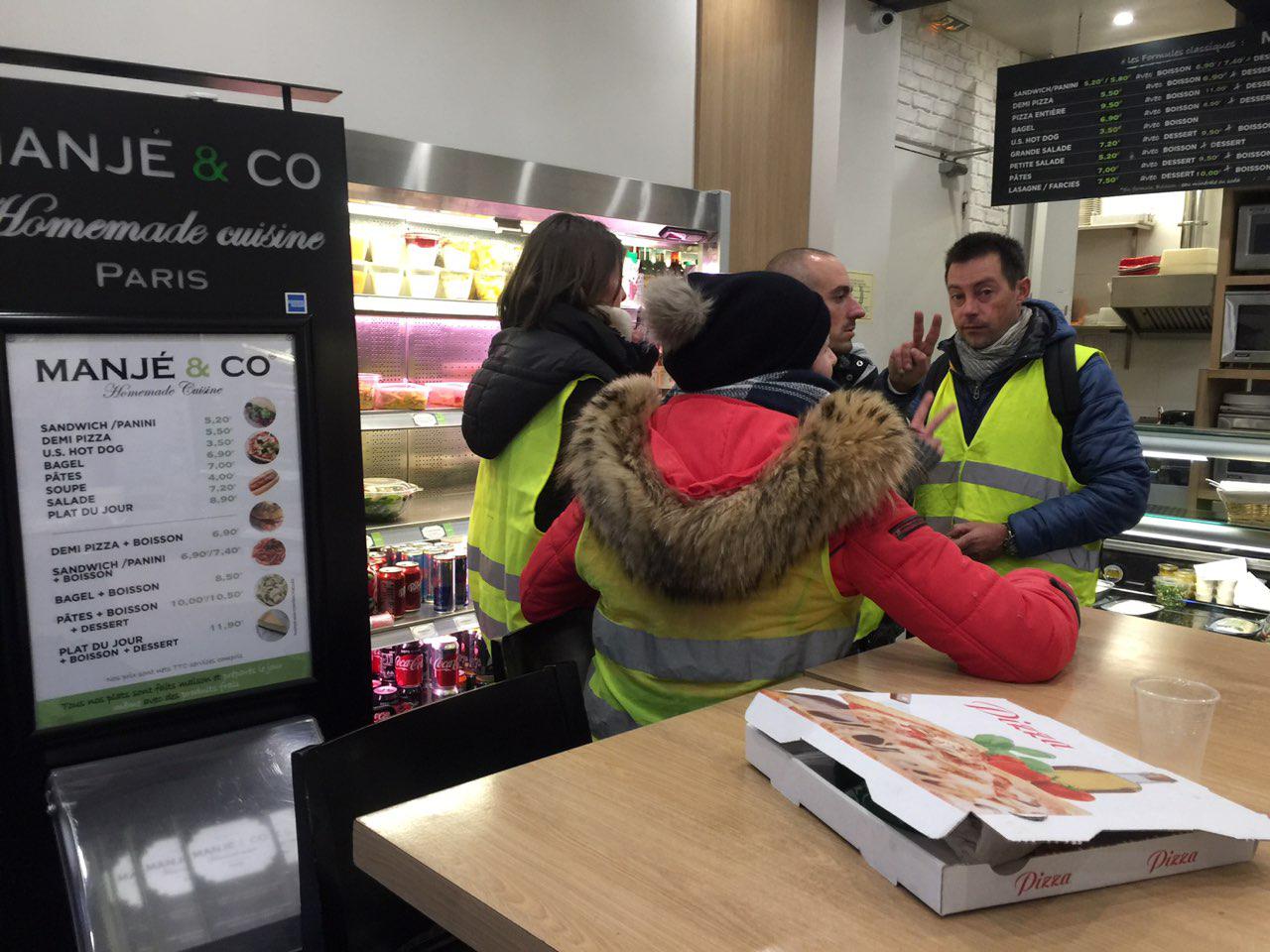 16.38 Под закусочной красуется подпись: Война войной, обед по расписанию. Практически все заведения в городе закрыты, работает несколько дешевых забегаловок, в которые забегают перекусить "желтые жилеты".